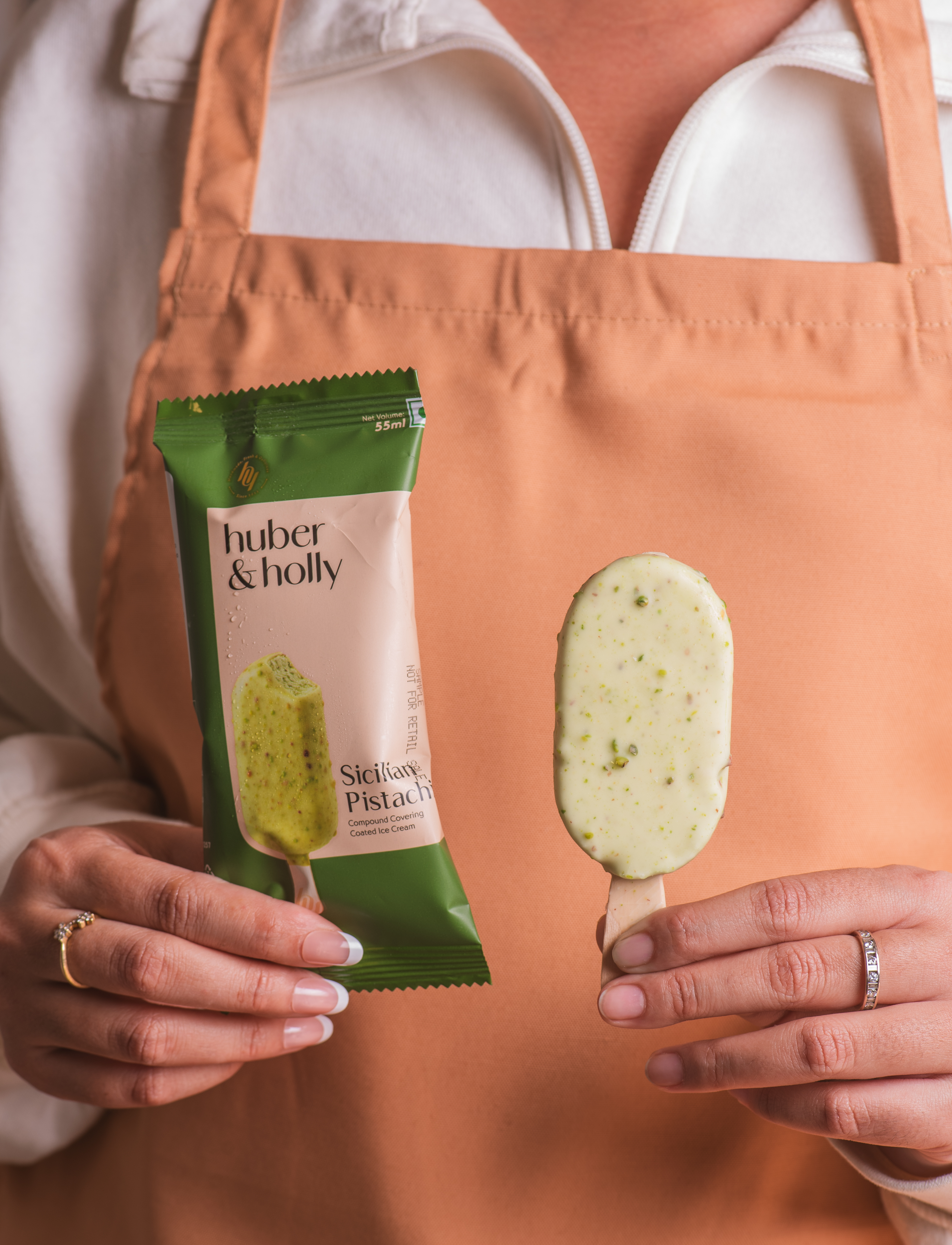 Creamy pistachio ice cream finished with a white chocolate shell